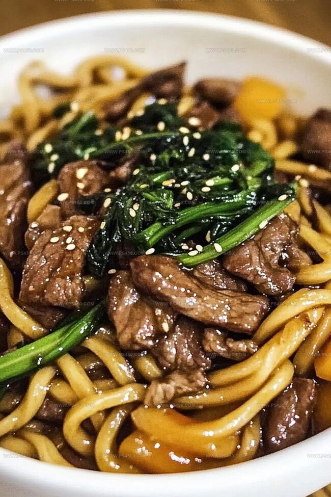 Tender strips of marbled beef dance alongside silky noodles, creating a symphony of textures and flavors.