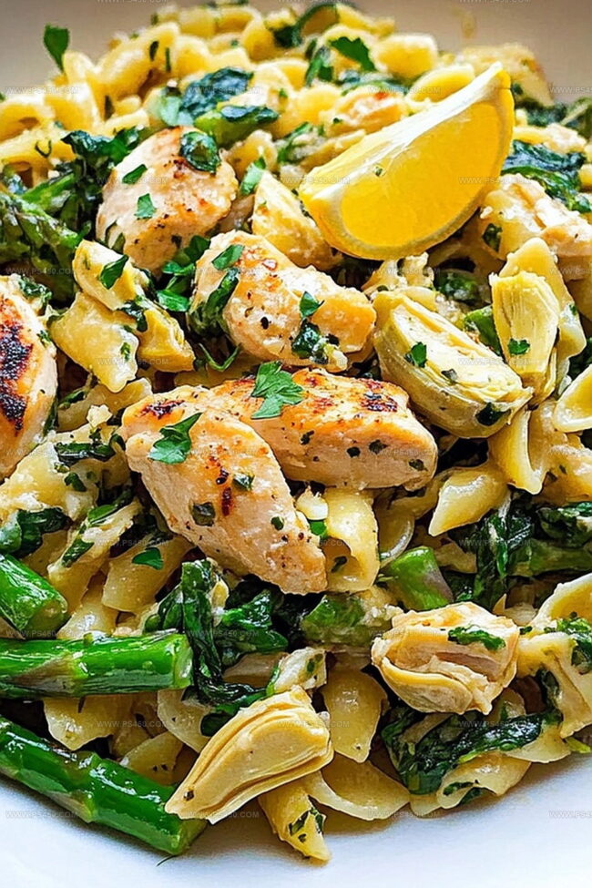 Pasta Base:Protein:Vegetables and Herbs:Sauce and Seasoning:Steps To Make Chicken And Asparagus Spinach And Artichoke Pasta