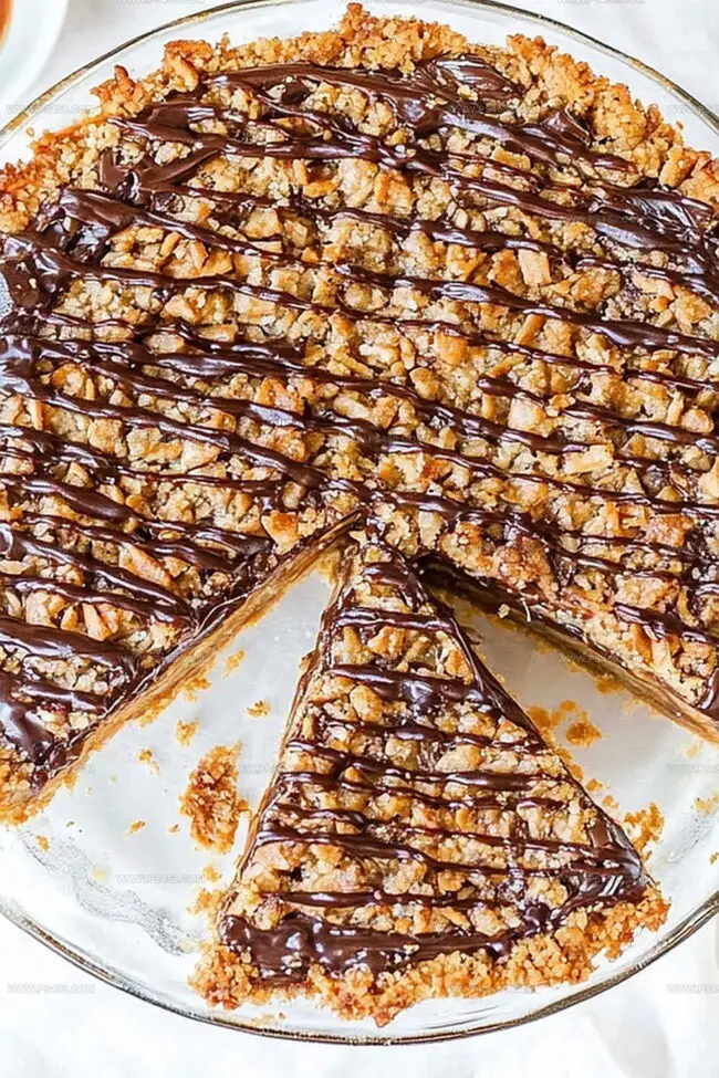 Chocolate drizzles dance across the surface of this incredible samoas cookie pie, creating a treat that echoes the beloved Girl Scout cookie flavor.