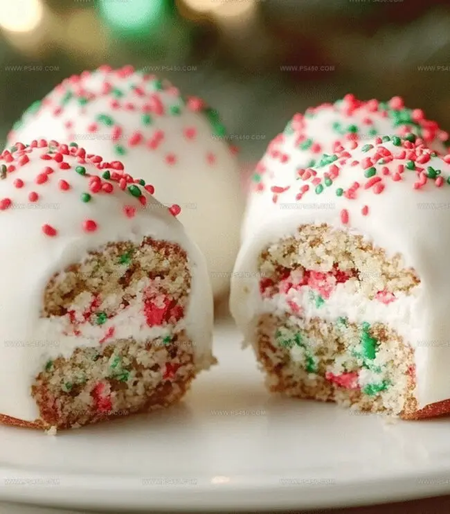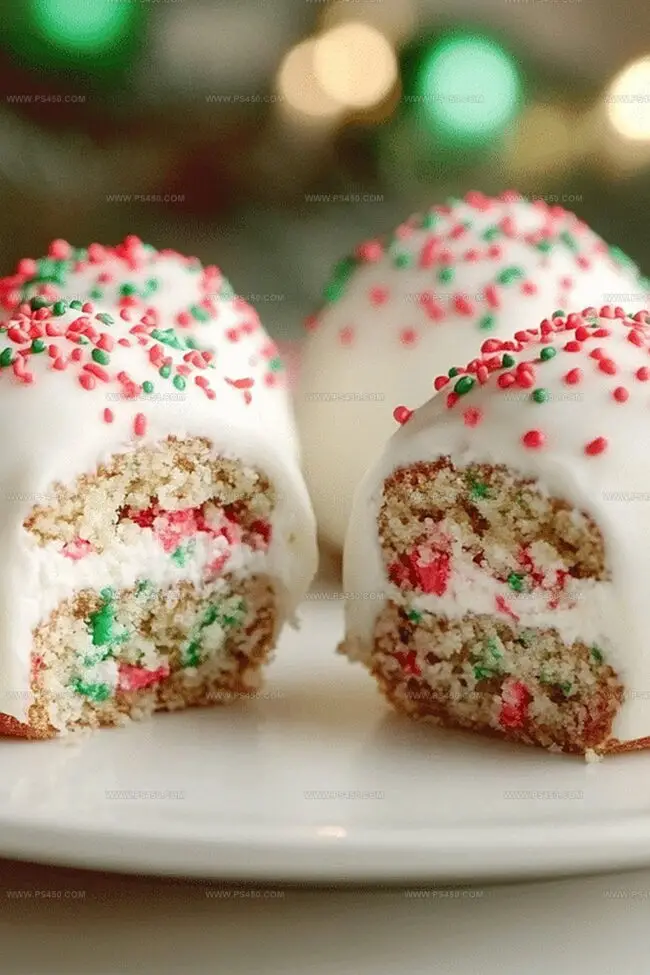 Each cake ball becomes a tiny celebration of Christmas spirit, rolled and decorated with colorful sprinkles and melted chocolate.