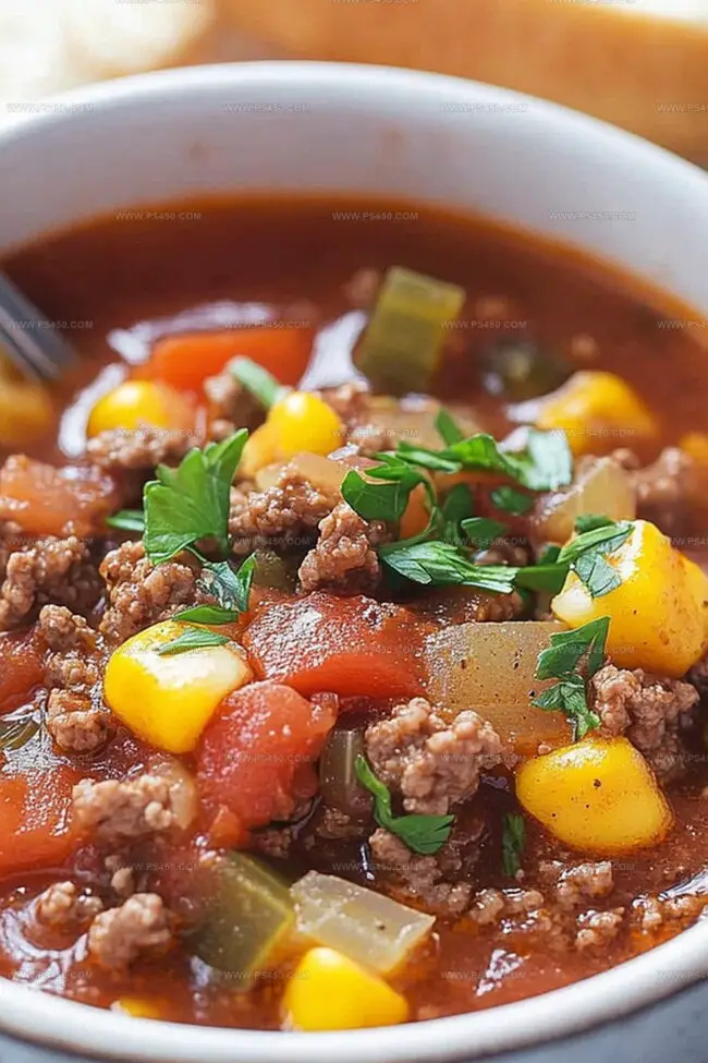 This soup combines classic hamburger ingredients like ground beef and seasonings into a hearty, comforting one-pot meal. It’s like enjoying a burger in soup form, packed with vegetables and rich flavors that make it more nutritious and satisfying than a traditional burger.