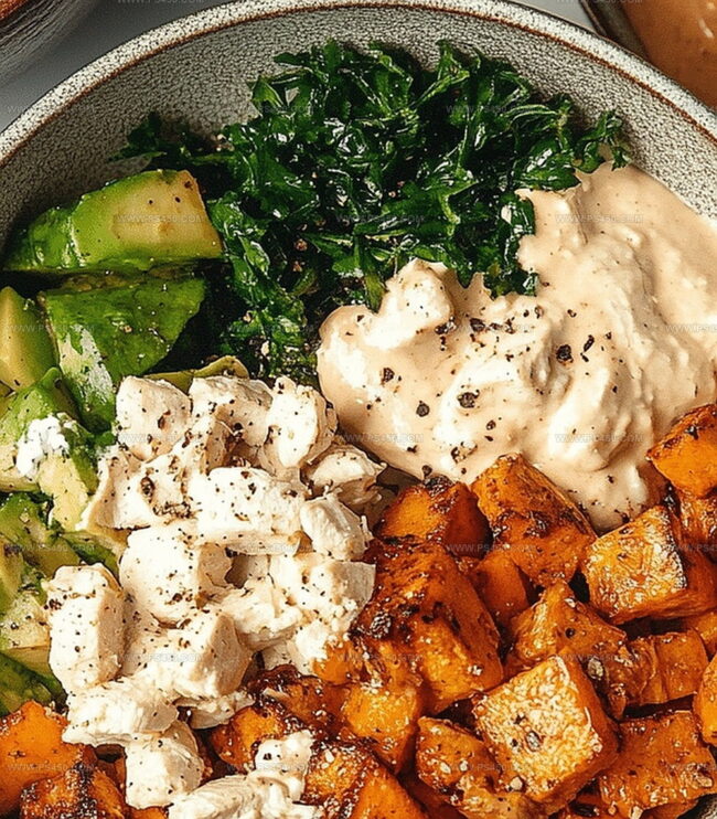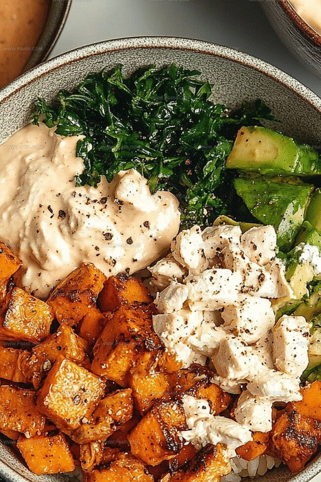 - Bowl Assembly: Layer fresh spinach or mixed greens as a base, then artfully arrange roasted sweet potato cubes, sizzling chicken, cherry tomatoes, cucumber, and red onion.