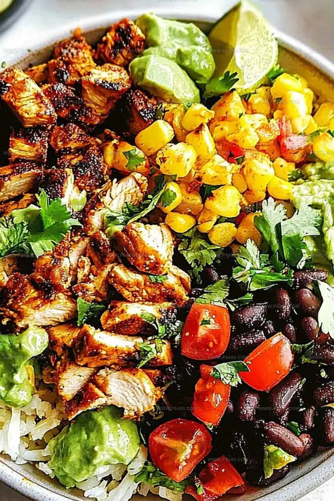 Artfully arrange black beans, sweet corn, juicy tomatoes, creamy avocado, sharp red onion, and fresh cilantro over the rice. Slice the cooked chicken and generously distribute it across the top.