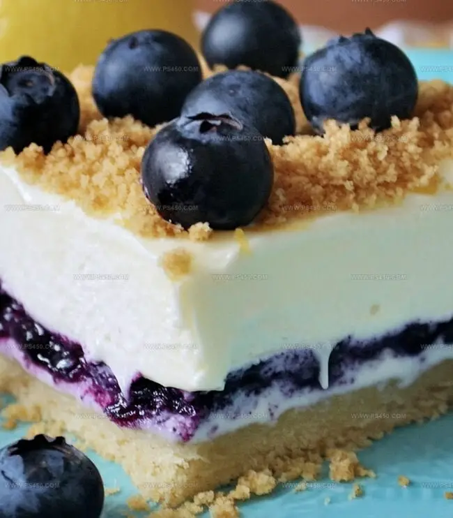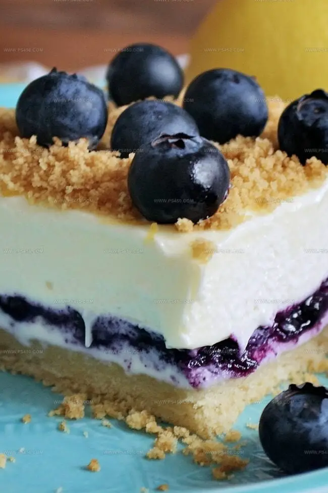 When ready to indulge, slice into squares. Watch as your guests marvel at the beautiful layers and incredible taste of this no-bake wonder. Each bite promises a refreshing dance of lemon brightness and blueberry sweetness.