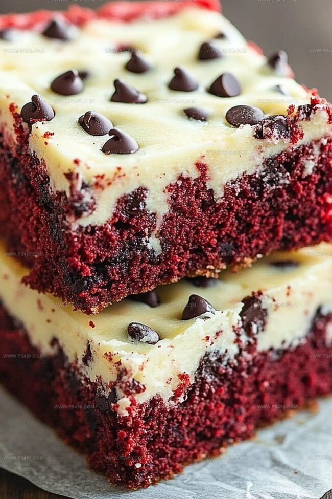 Decadent red velvet chocolate chip cheesecake bars invite you on a delightful culinary adventure.
