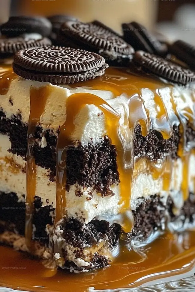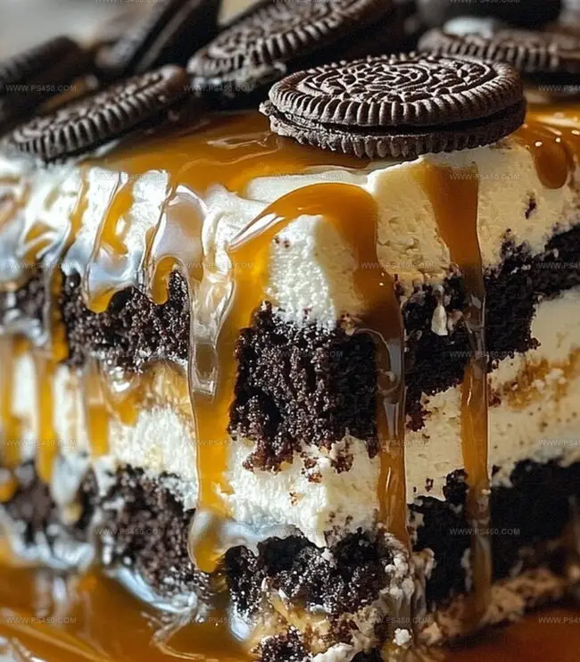 Grab a rectangular baking dish and spread a thin, delicate layer of whipped cream across the bottom. Create a beautiful foundation of Oreo cookies, placing them side by side to cover the cream completely. Drizzle that amazing caramel sauce generously over the cookies. Add a thick, luxurious blanket of whipped cream on top. Repeat these layers:Continue building until you’ve used all your ingredients, making sure to finish with a crowning layer of whipped cream.