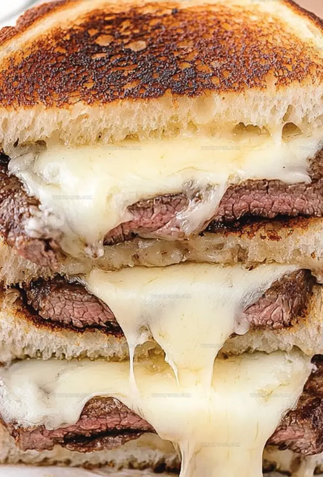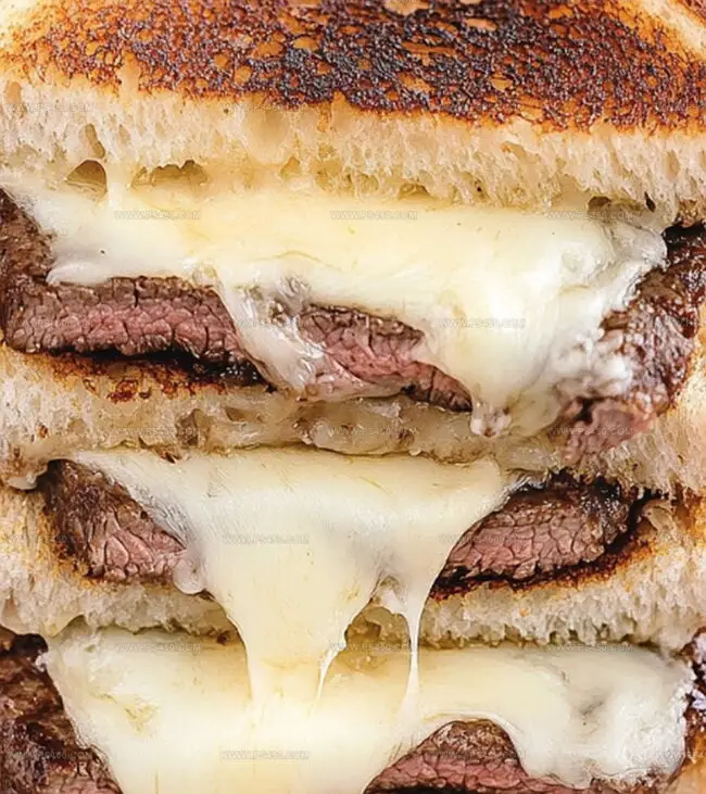 Gourmet grilled cheese featuring juicy steak nestles between crispy, buttery bread slices. Melted cheese and perfectly seasoned beef create a mouthwatering sandwich you’ll crave again and again.