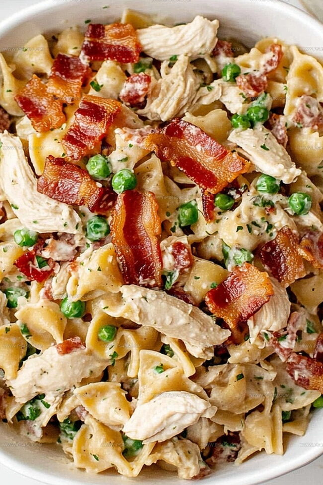 Crisp bacon bits and tender chicken chunks create a delightful melody of flavors dancing across your plate.