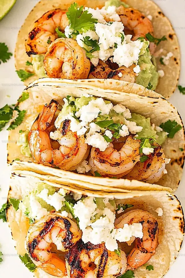 Layer each tortilla with a smear of creamy sauce. Top with crisp cabbage, those juicy grilled shrimp, creamy avocado slices, and fresh cilantro. Squeeze a zingy lime wedge over the top for extra punch.